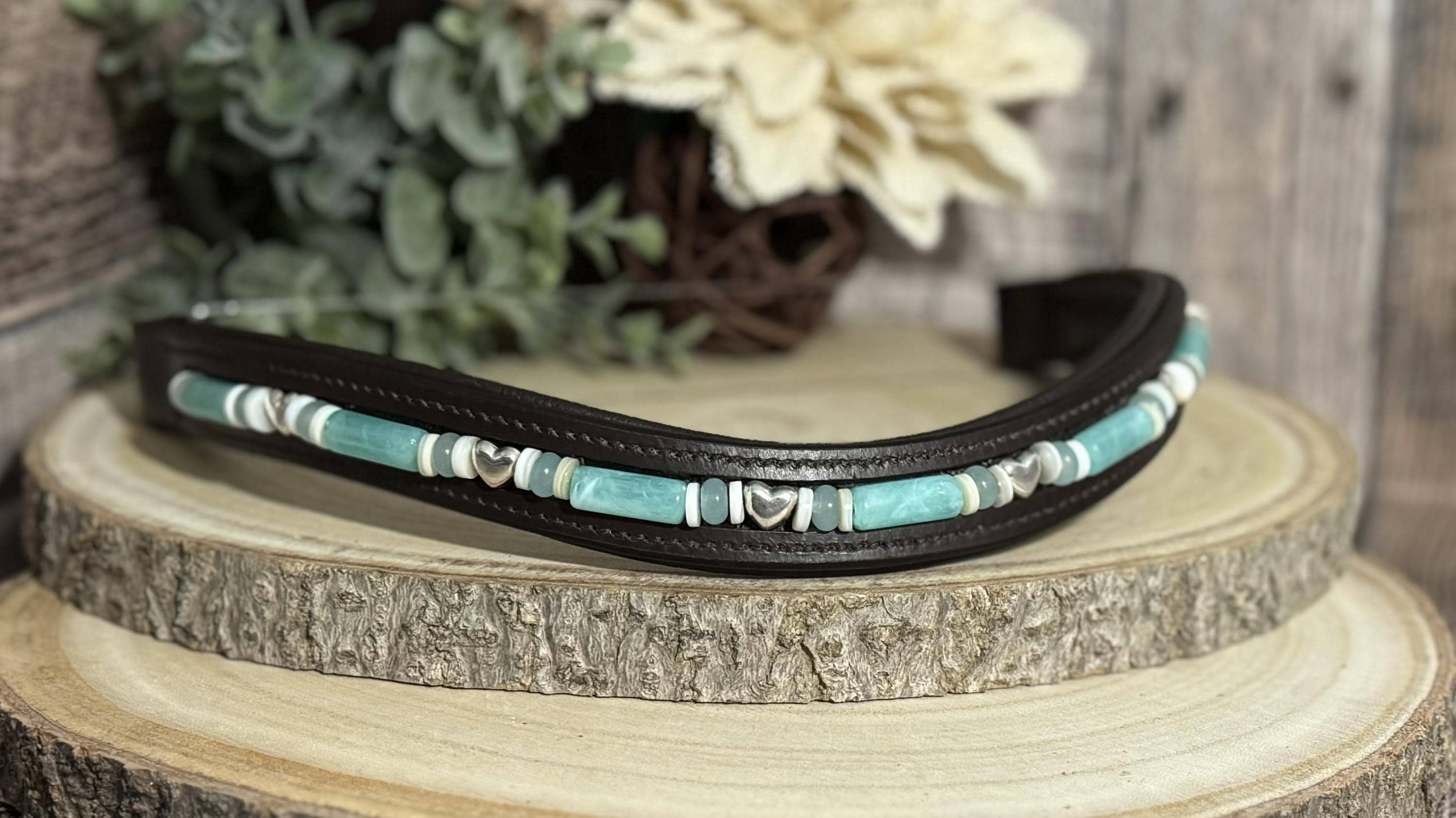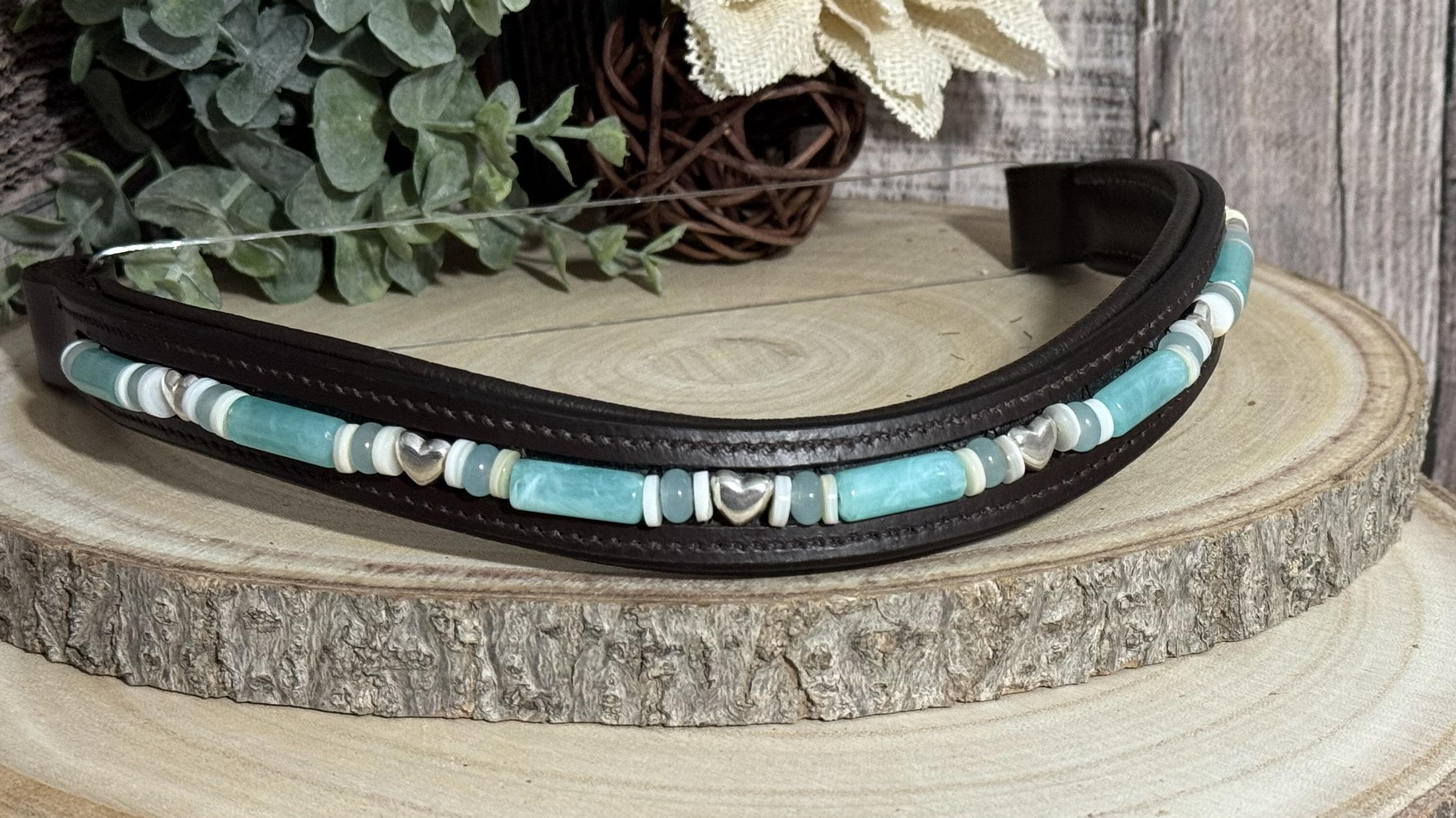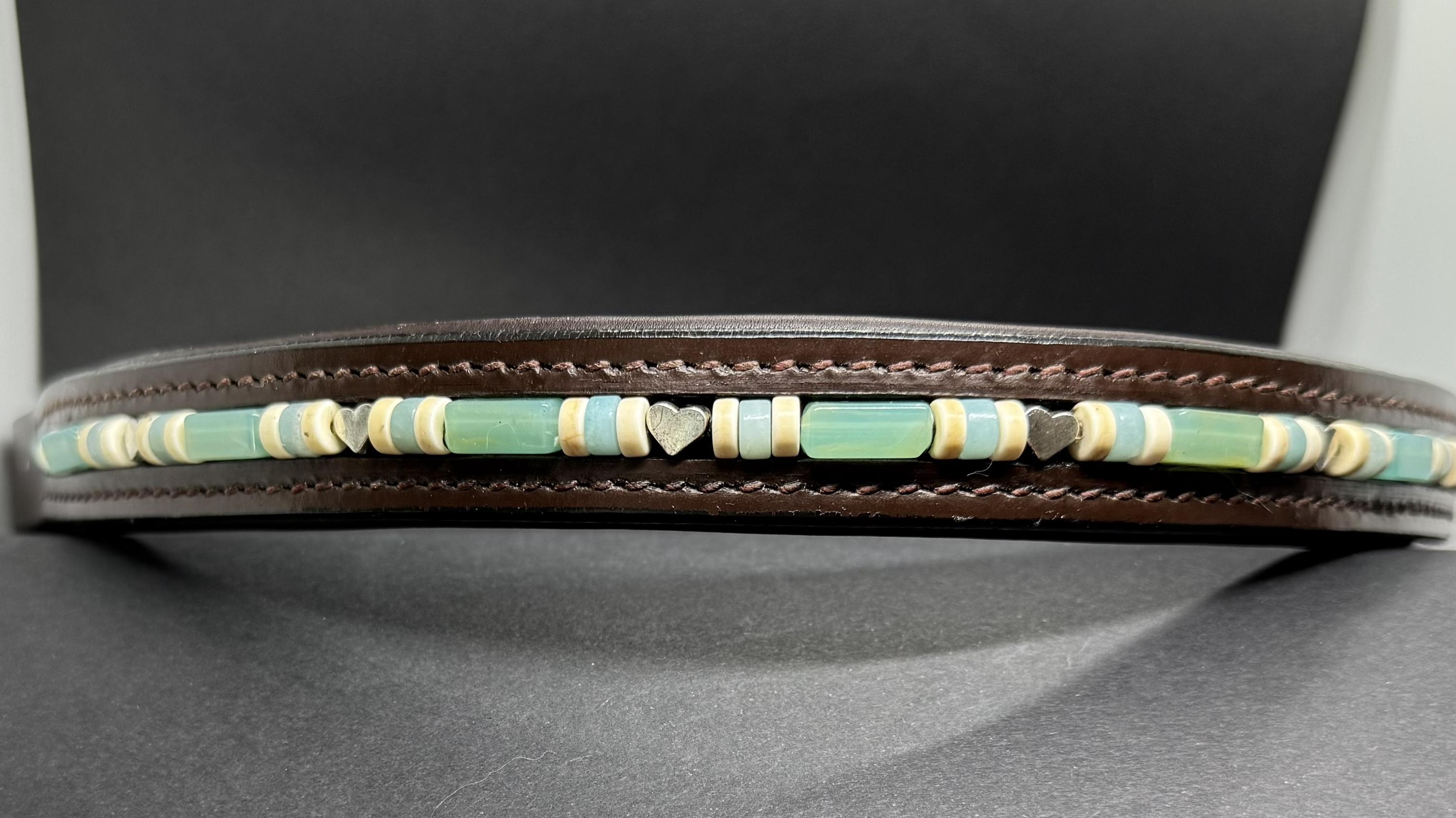 A repeating motif of sage tubes, cream shell rondelles, glass sage colored rondelles and silver hearts.