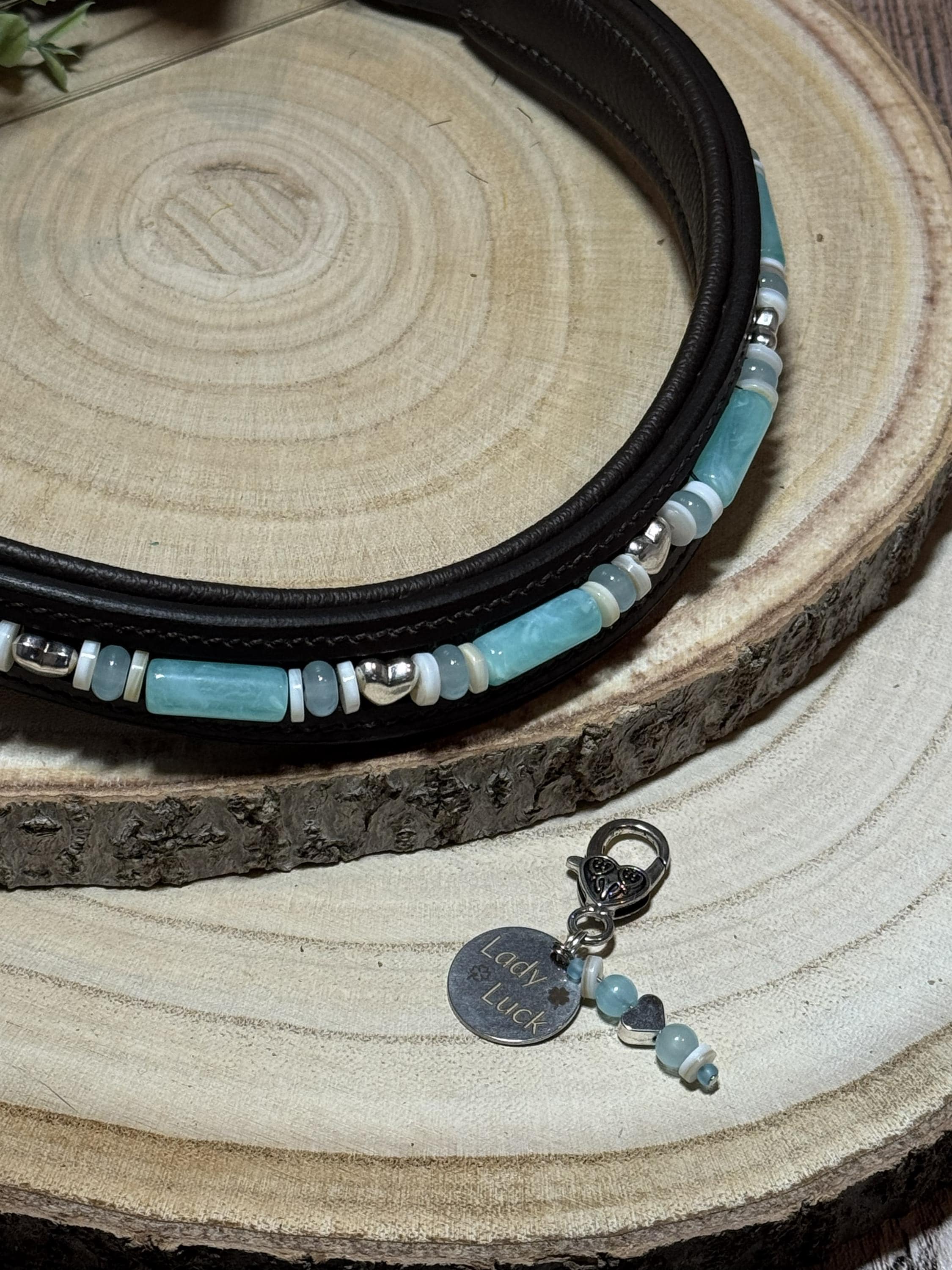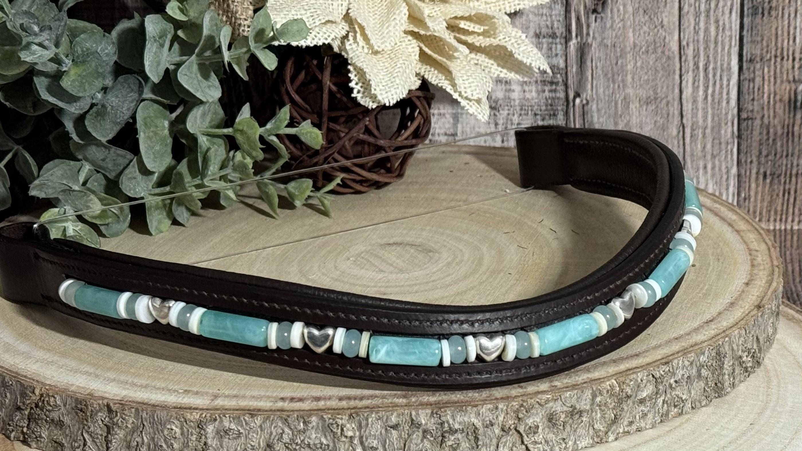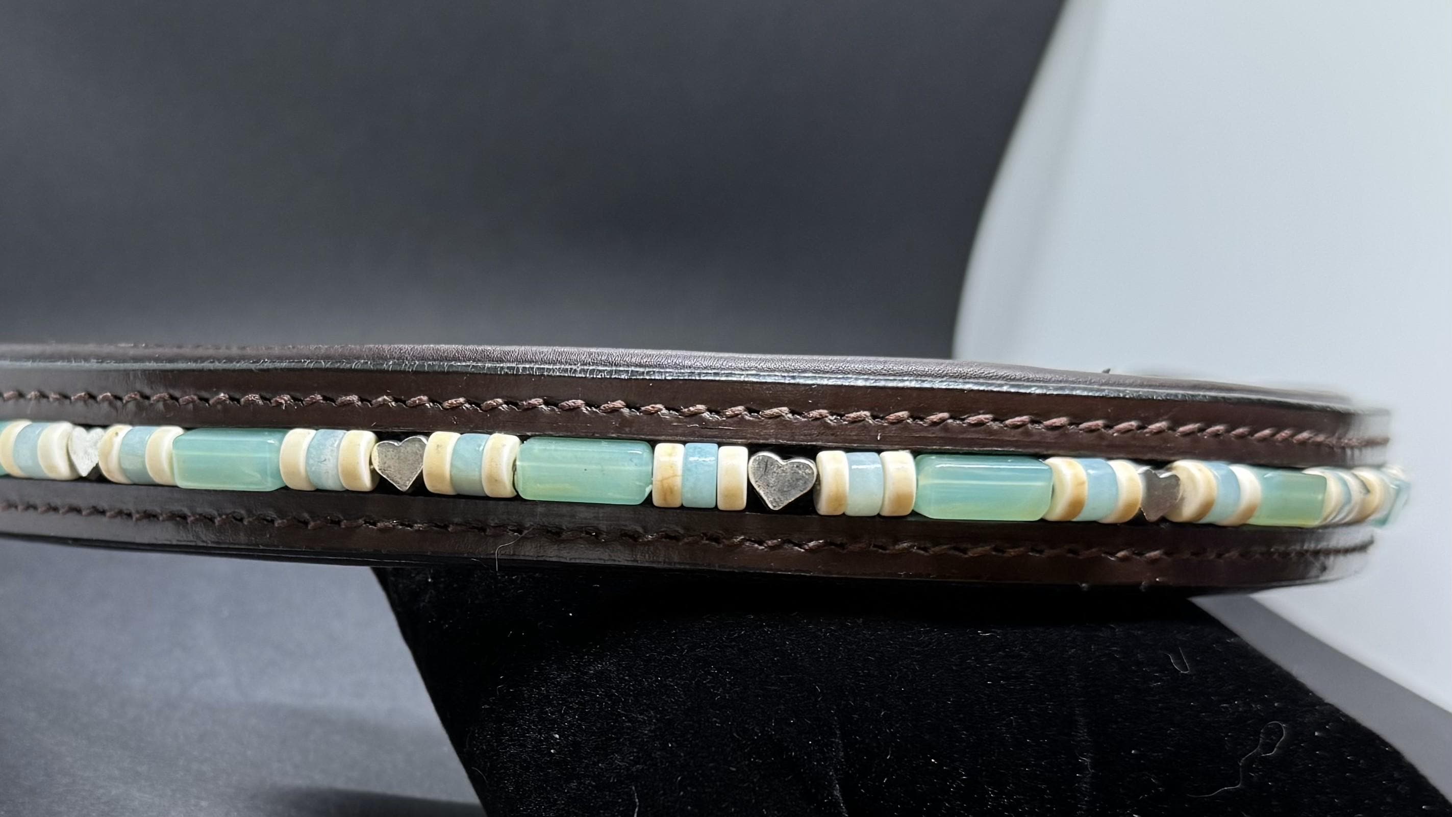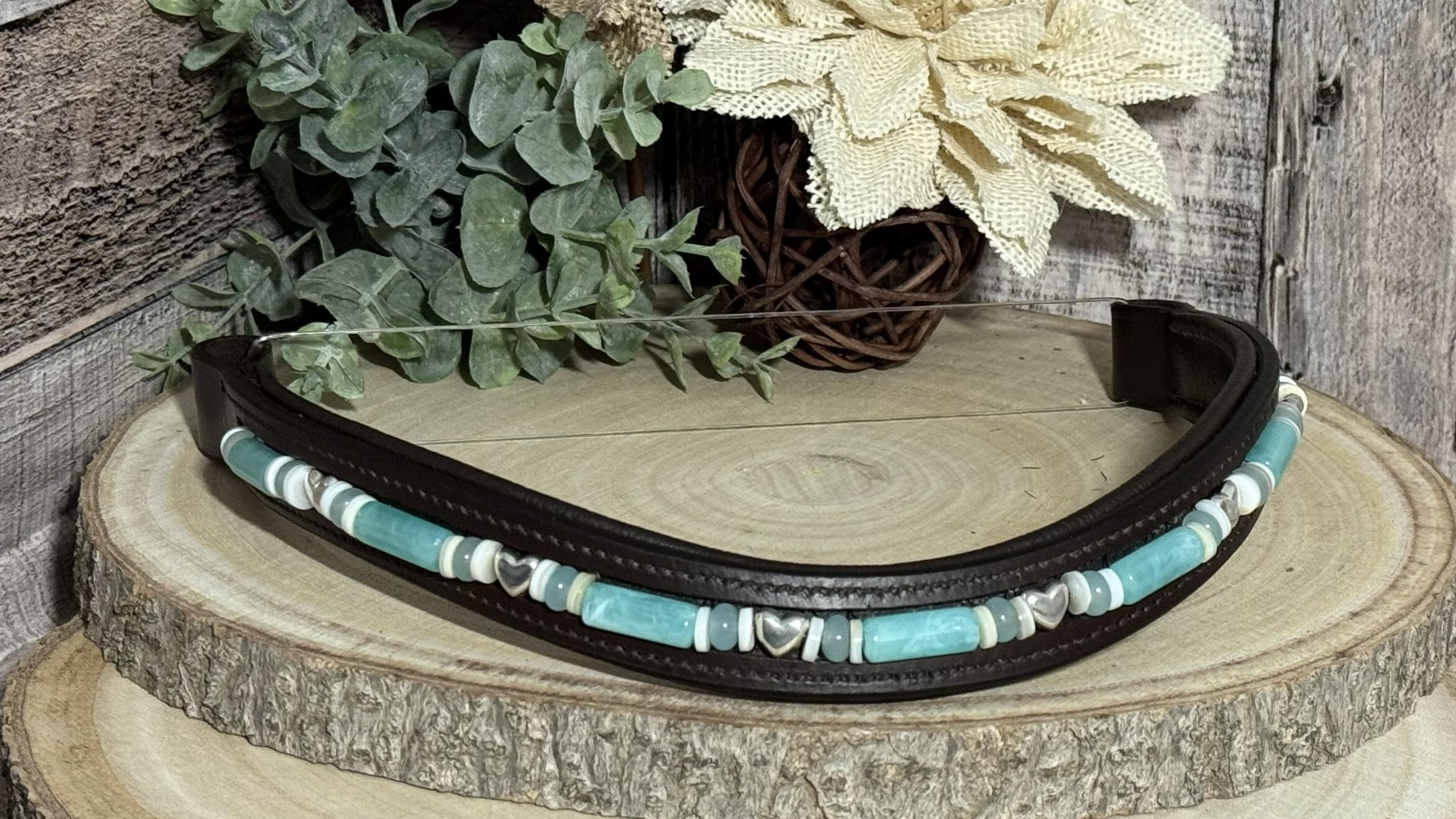 A repeating motif of sage tubes, cream shell rondelles, glass sage colored rondelles and silver hearts.